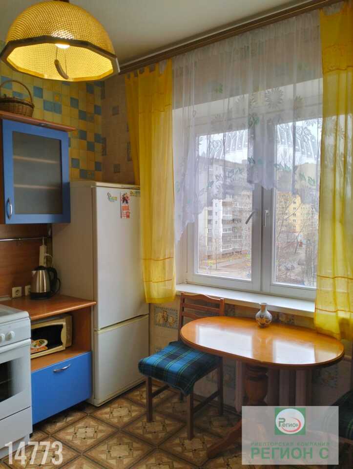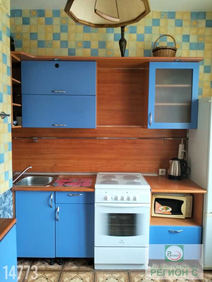 Квартира с бытовой техникой, большой кухней и комнатой.