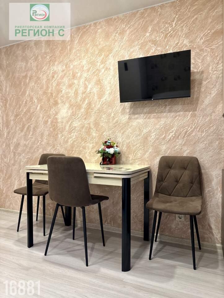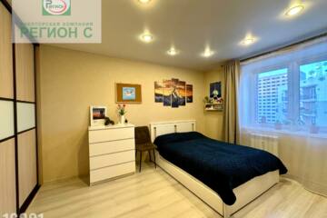 Комната большая, есть возможность выделить зоны для отдыха и работы. Потолки натяжные, с подсветкой по всей квартире.