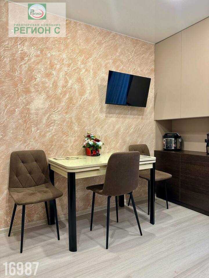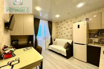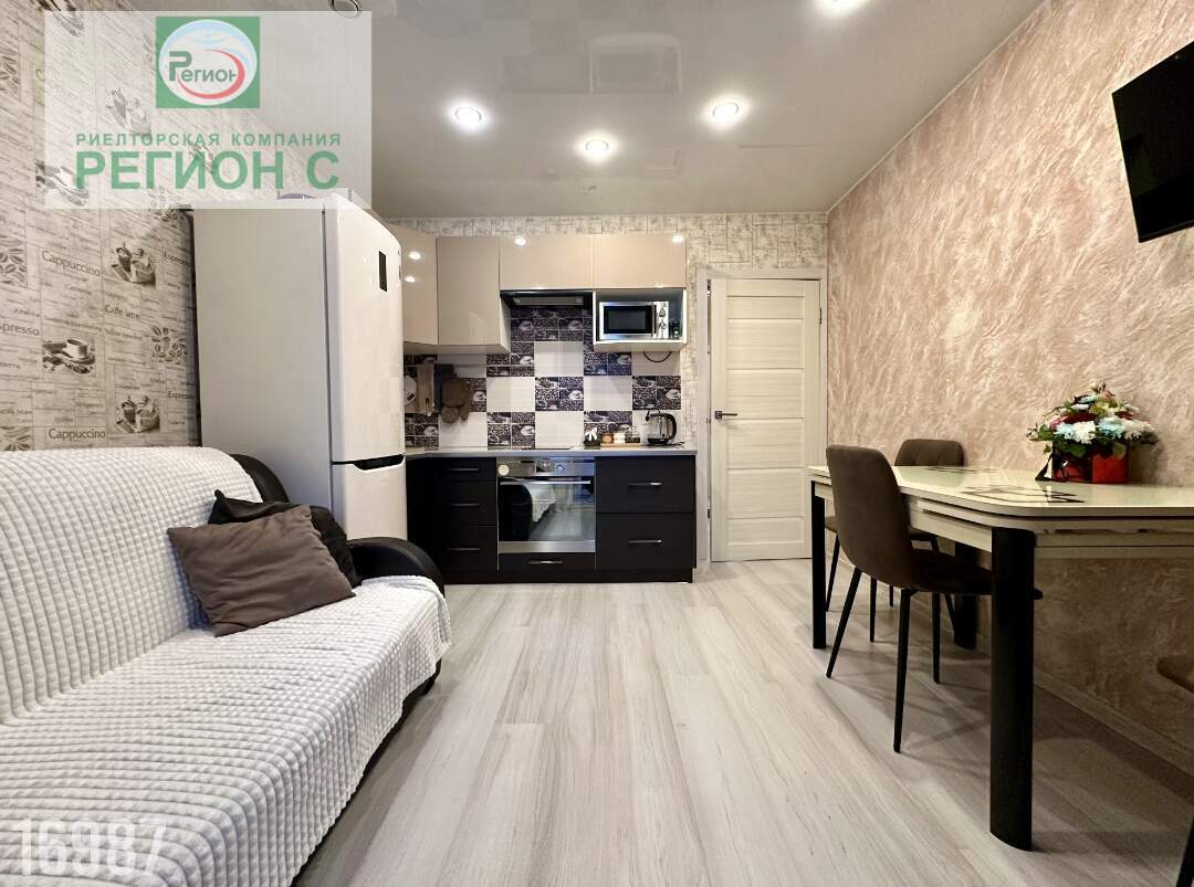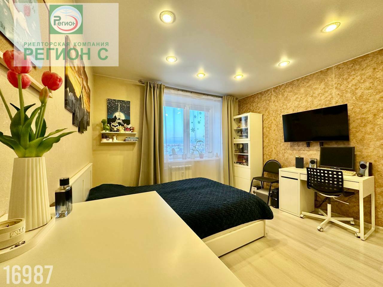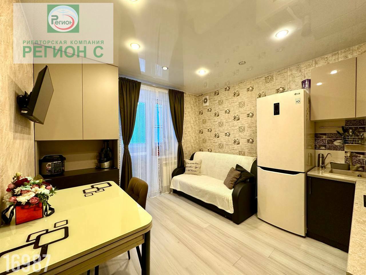 Комната большая, есть возможность выделить зоны для отдыха и работы. Потолки натяжные, с подсветкой по всей квартире.