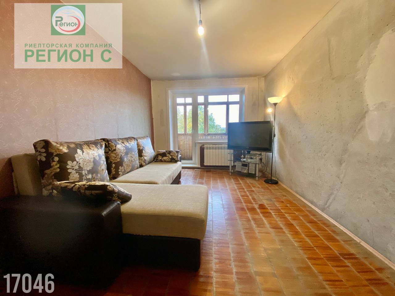Вместительный балкон в большой комнате застеклён деревянными панелями.